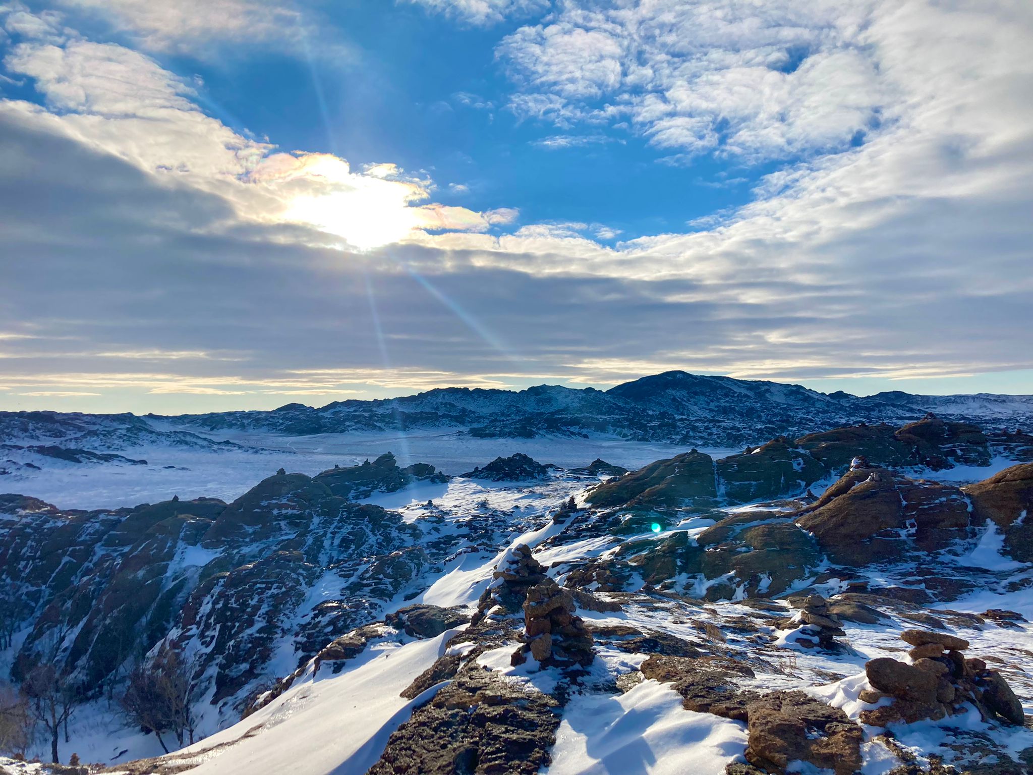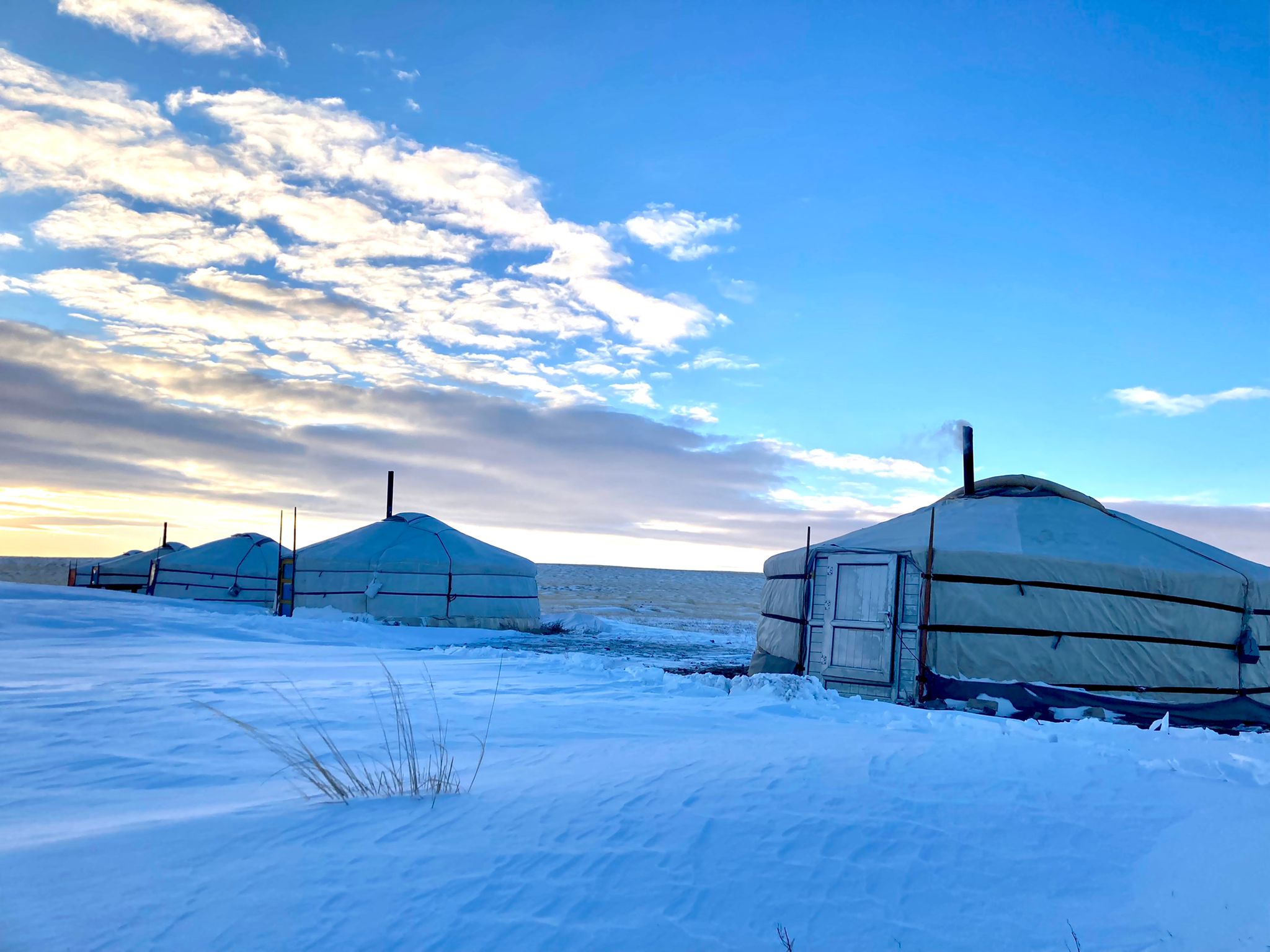 De wagen (lees: een oud busje uit wederom Rusland) volgeladen, rijden we naar onze eerste bestemming, een rock formation. Na zeker zeven uur in het oude busje gezeten te hebben starten we onze hike omhoog over vreselijke gladde stenen. Gelukkig ligt er veel sneeuw dus ik besluit daarop te gaan lopen omdat ik denk dat ik daardoor meer grip heb met als gevolg dat ik de diepte moeilijk kan inschatten en soms meer dan een halve meter in de sneeuw zak. Ik weet nu wel dat de aankoop van mijn nieuwe wandelschoenen een zeer goed idee was omdat ik erachter kom dat ze waterdicht zijn. Naar beneden hiken vind ik nooit zoβn pretje maar ik ben blijkbaar als eerste beneden bij het busje. Zodra iedereen er is vertrekken we naar onze eerste slaapplaats. Het is een yurt, zoals verwacht, met zes bedden en een kachel in het midden. De kachel wordt direct aangestoken en gevuld met kamelen poep. We worden vervolgens uitgenodigd bij de familie voor thee en een homemade rijstesoep. Onze eigen kok heeft ondertussen een heerlijk avondmaal bereid voor ons. Na het eten kruipen we allen snel in bed met onze kleren aan vanwege de kou. Ik val meteen in slaap.