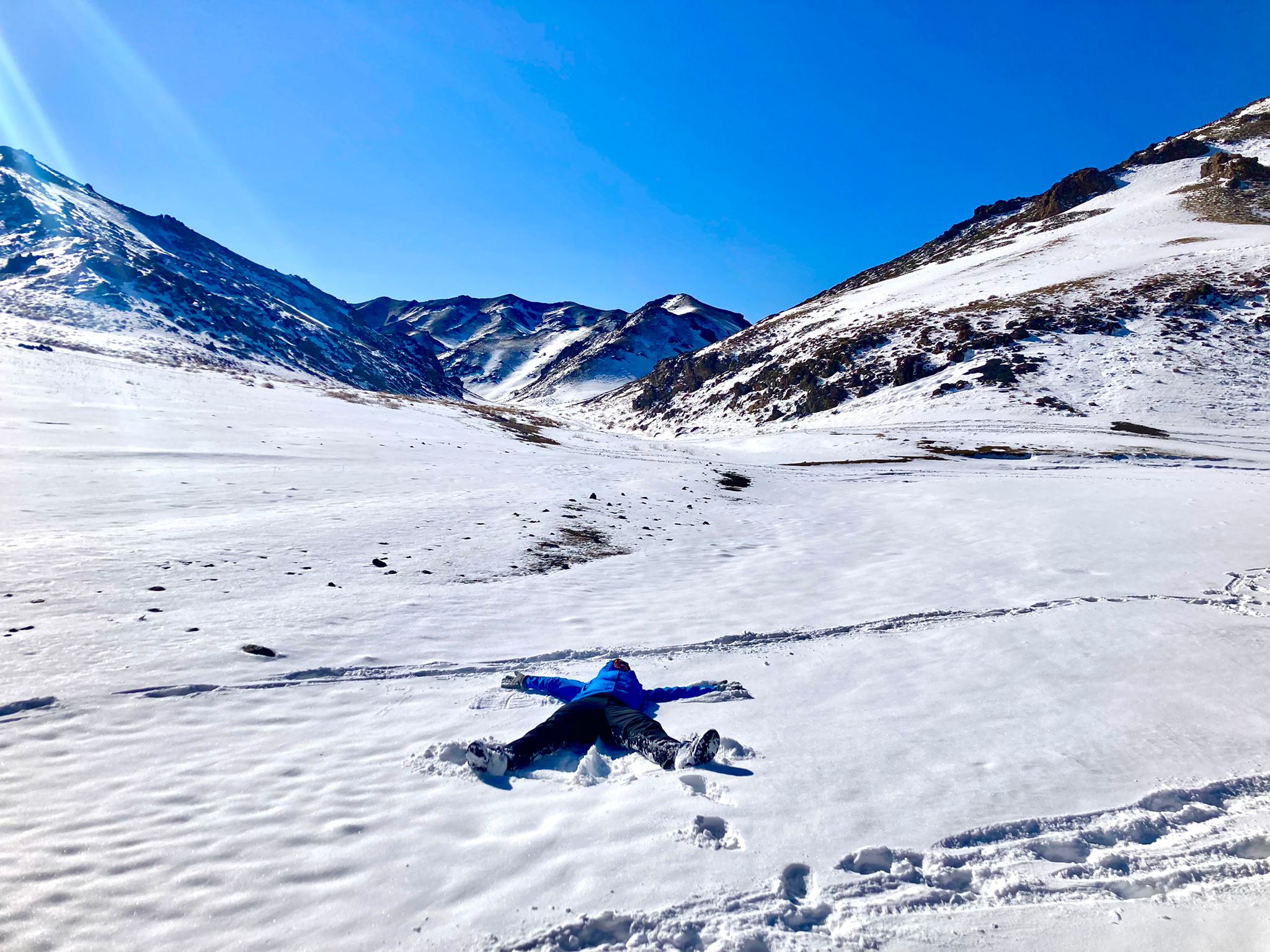 Ik kijk op mijn telefoon en zie dat het midden in de nacht is. Jeetje wat is het verschrikkelijk koud zeg en probeer, al rillend , weer in slaap te vallen. De volgende keer als ik wakker word is iedereen al wakker en wordt er op de deur geklopt: βbreakfastβ. Om 09:00 uur precies vertrekken we naar de Ice Valley waar we een stuk gaan hiken in de sneeuw. Het is werkelijk een prachtige vallei en we banen ons een weg over de rotsen in het water om zo steeds de overkant te bereiken. Op een gegeven moment kunnen we niet meer verder en geeft Khulan, onze kok/ gids aan dat we beter terug kunnen gaan. De sneeuw ziet er zo aantrekkelijk uit dat ik besluit een Snow angel te maken, Yuki het meisje uit Japan filmt mij al lachend en denkt volgens mij dat ik gek ben geworden om met -5 in de sneeuw te gaan liggen.