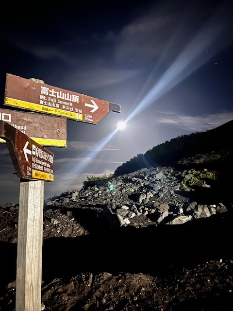 Een van de mannen neemt de leiding. De route is niet lastig en het staat goed aangegeven. Na het eerste uur en enorm veel gekletst te hebben met elkaar geef ik opeens aan dat deze weg wel enorm steil is en veel moeite kost. Alhoewel ik achter de leider aan loop en eigenlijk best wel trots ben op mijn conditie valt het mij op dat de anderen een stuk achter liggen en er geen andere mensen zijn die de berg aan het beklimmen zijn. Al vrij direct komen wij erachter dat we een andere onbekende route aan het lopen zijn, namelijk de route van de graafmachines die totaal niets te maken hebben met Mount Fuji. Het is een vreselijke steile weg omhoog bestaande uit zeer kleine kiezels waardoor je steeds geen grip hebt en elke twee stappen die je omhoog hiked er vanzelf eentje weer daalt. Het is een zeer vermoeide start. Eentje waarbij ik mij totaal niet laat kennen. Na een aantal uur komen we weer vanzelf op het reguliere pad. Enigszins verheugd maar toch wel al behoorlijk vermoeid vervolgen we de klim zoals het zou moeten.